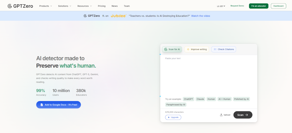 As AI-generated content becomes increasingly prevalent, GPTZero provides enterprise-grade detection capabilities to verify originality and ensure your content meets quality standards.